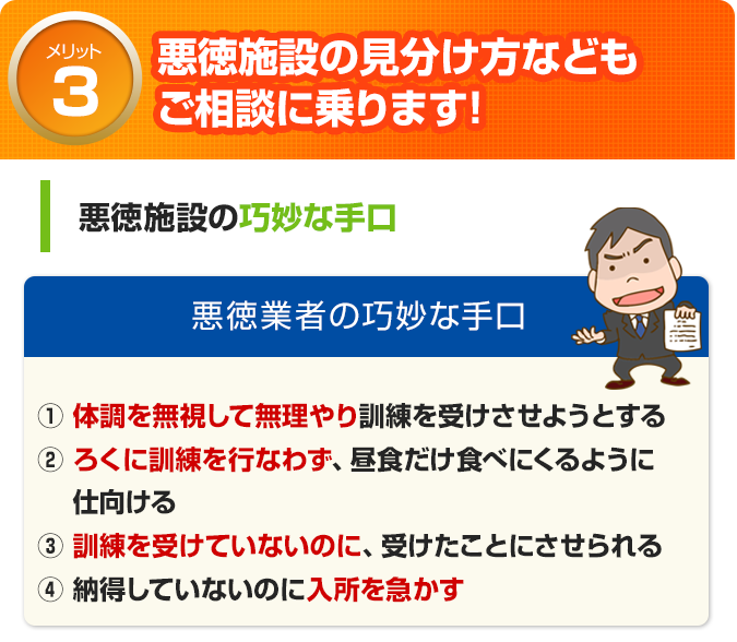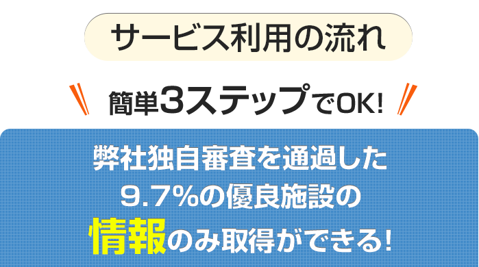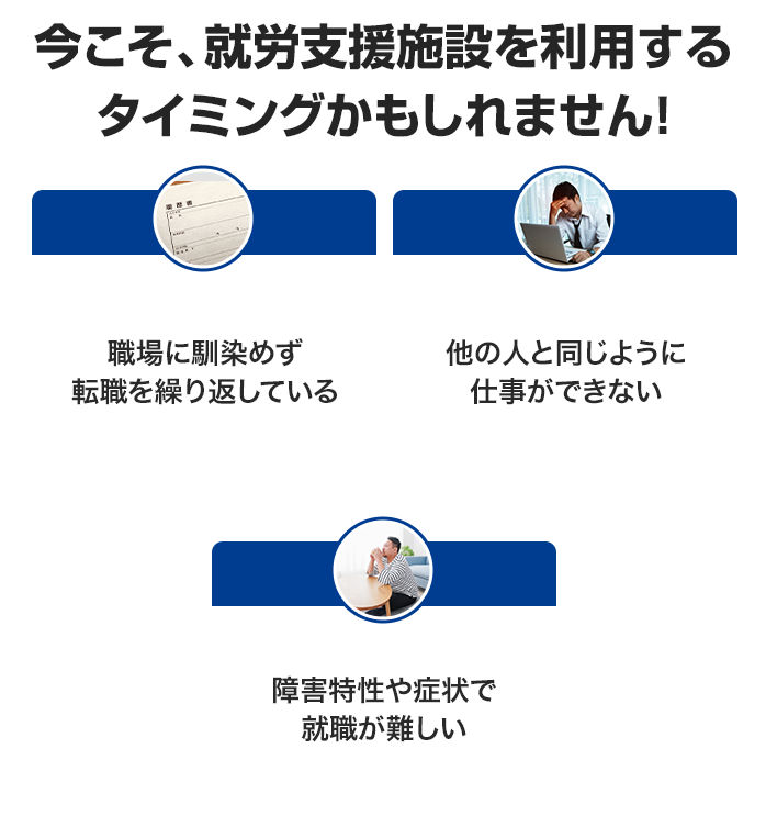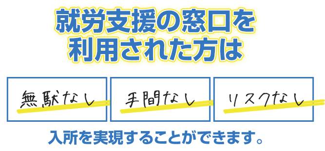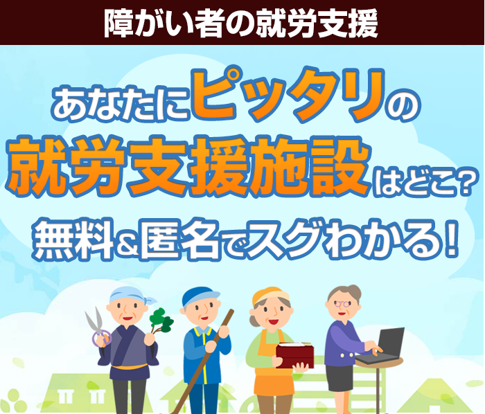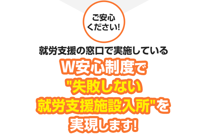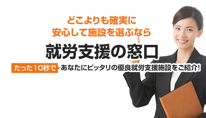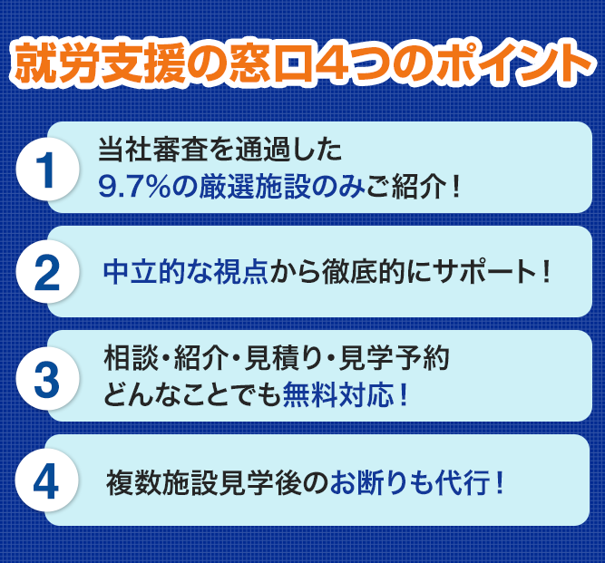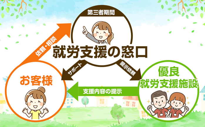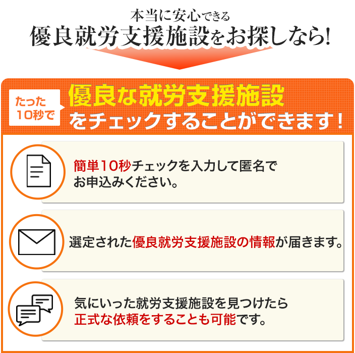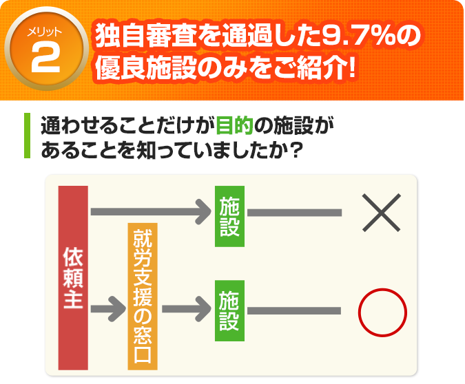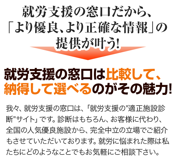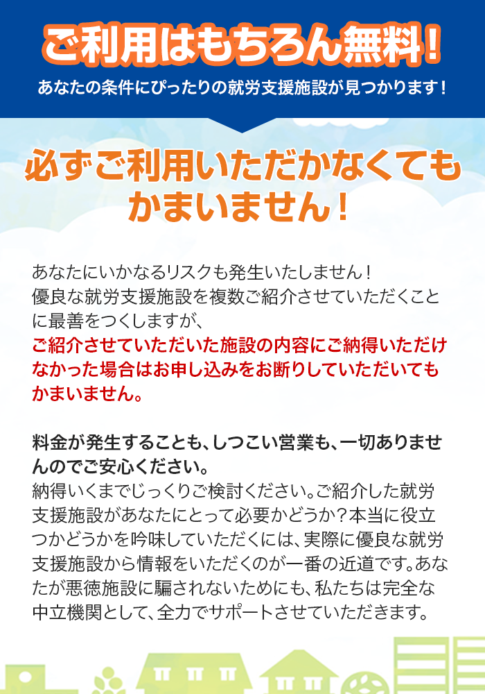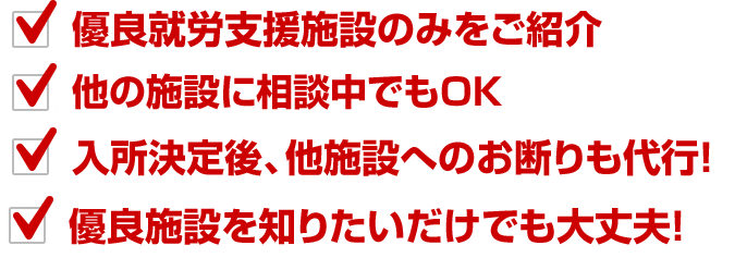 我々は安心・信頼して就労支援を依頼できる優良施設を無料で紹介している第三者機関です。独立した第三者的な立場からご相談者様のご要望をお聴きし、ご希望にお答えできる就労支援施設を無料でご紹介しています。 単なるご紹介ではなく、日本国内に存在する就労支援施設の中から当社の厳しい審査基準を満たした、9.7%の「人気施設」のみをご紹介します。さらに、ご提案だけで終わるのではなく、見学のアテンドやお断り代行など、プロの専門家が責任を持ってお付き合いいたします。 ここれらのサービスを全て、完全無料でサポートさせていただきます。 私たちは、これまで悪質業者をたくさん見てきました。自社の売上だけを重視して訓練をおろそかにする施設、利用者の意向を無視する施設、長期間訓練を受けても就職にまでたどり着けないなど…利用者の不安が尽きないこの業界を改革するために活動しています。 日本国内にある就労支援施設の中から「あなたのご要望に沿った優良施設」を診断しご紹介いたします。お気軽にご相談くださいませ。